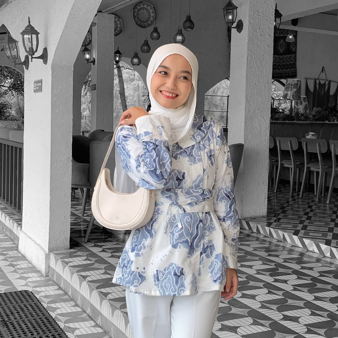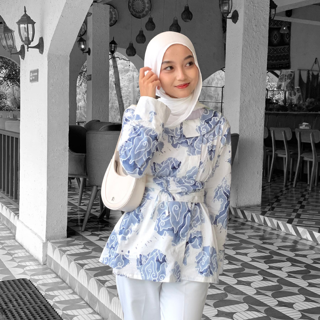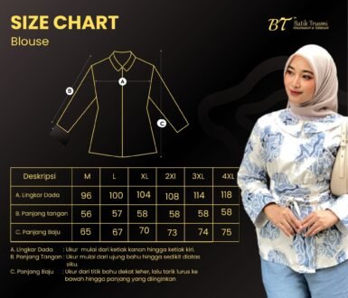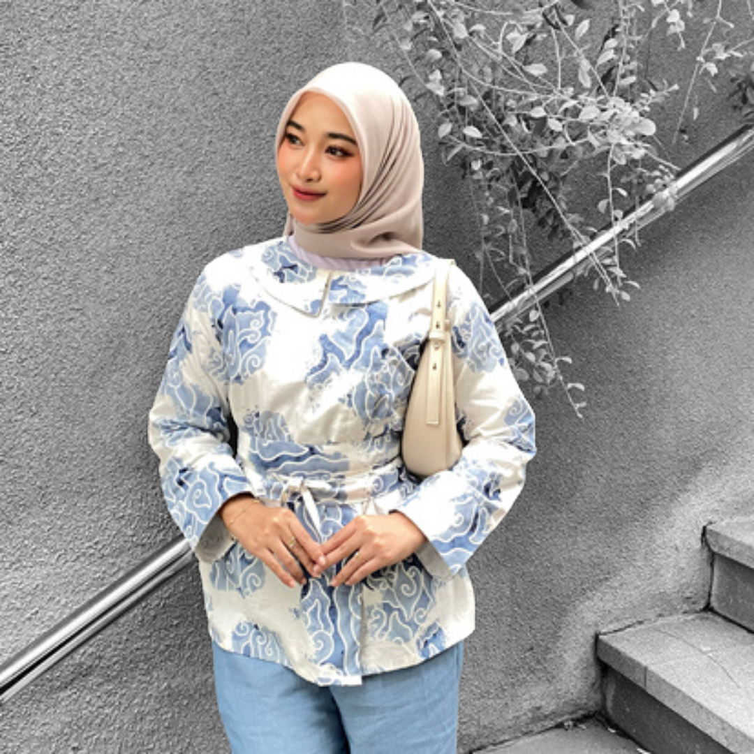 Atasan wanita Batik Trusmi ini menampilkan keindahan motif Mega Mendung Bumi yang khas dengan perpaduan warna biru elegan. Dilengkapi detail obi mop yang memberikan aksen unik dan memperkuat kesan etnik modern, blouse batik ini cocok untuk berbagai kesempatan, baik formal maupun kasual.