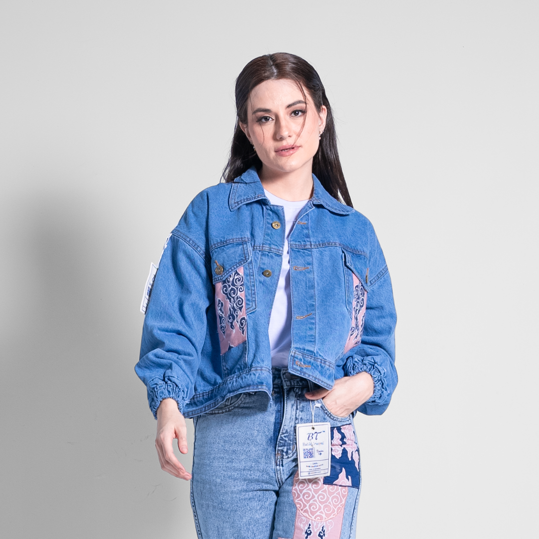 Jaket crop denim kombinasi Batik Trusmi tampil modern, modis, dan berkelas dengan sentuhan batik eksklusif khas Cirebon.