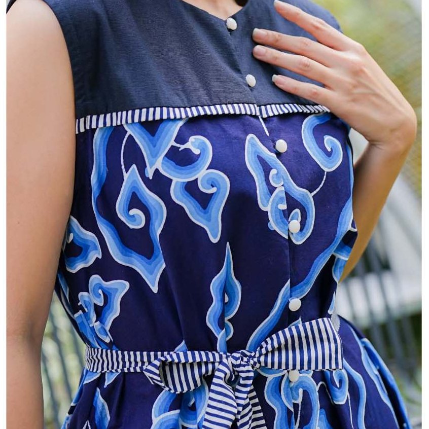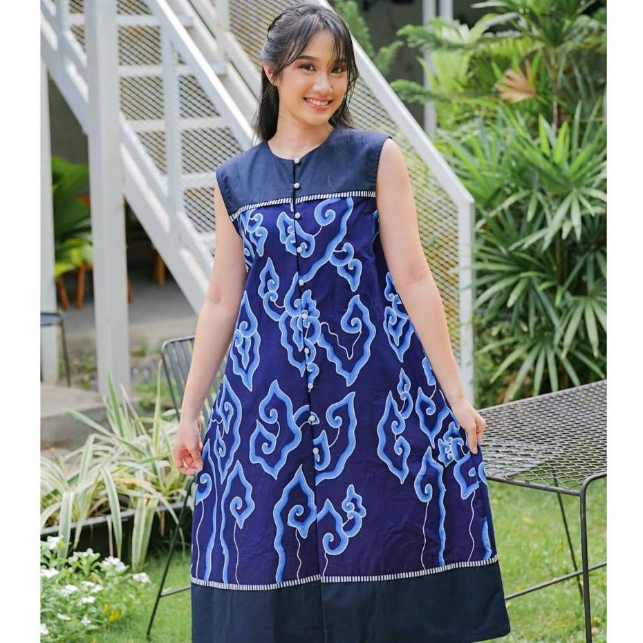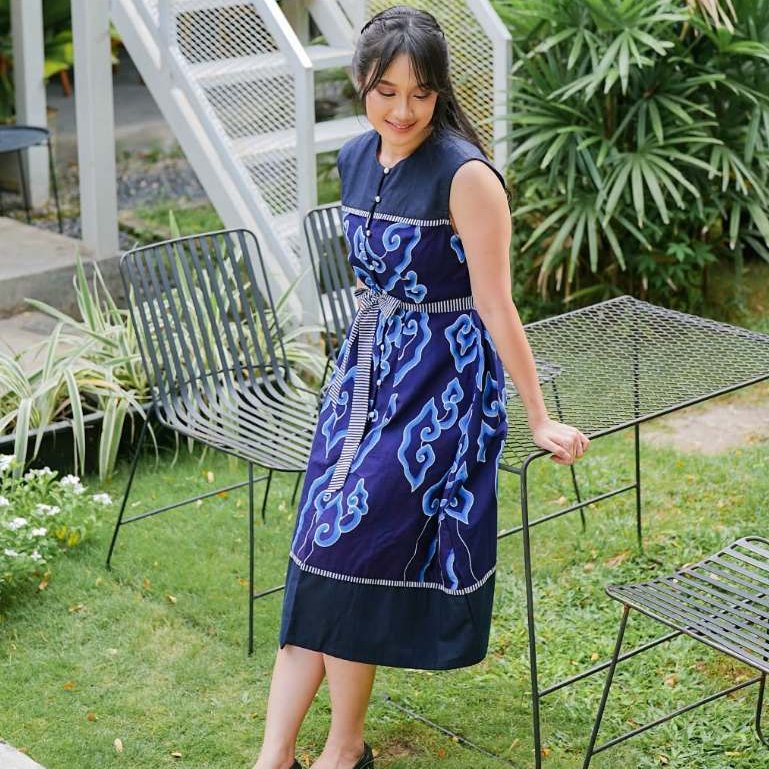 Batik Trusmi Dress Batik Tulis Mega Mendung Premium Elara Biru MYD
