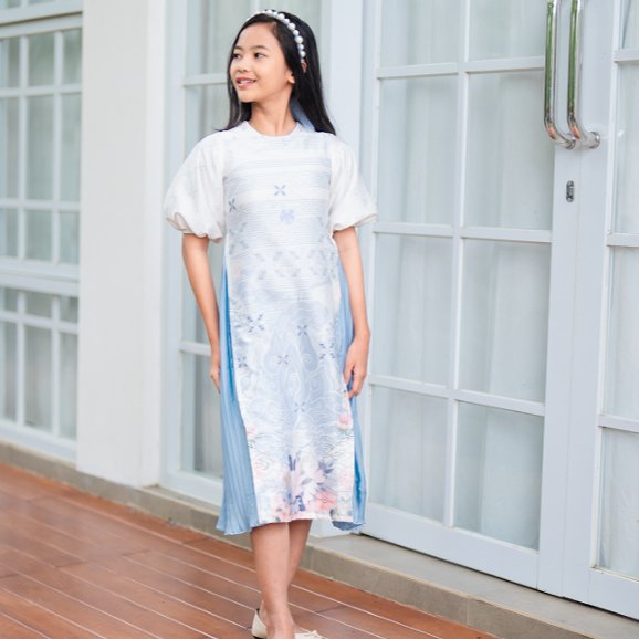 Dibuat dari bahan satin premium berkualitas tinggi, dress ini memiliki tekstur halus, ringan, dan sejuk di kulit. Potongan A-line dengan aksen plisket biru di sisi samping memberikan tampilan elegan sekaligus memudahkan gerak anak, sementara motif batik lembut berpadu bunga pastel menambah kesan manis dan menawan.