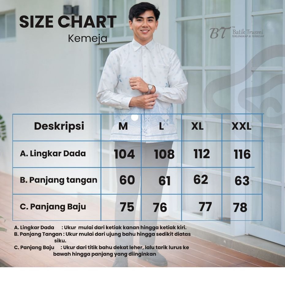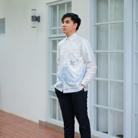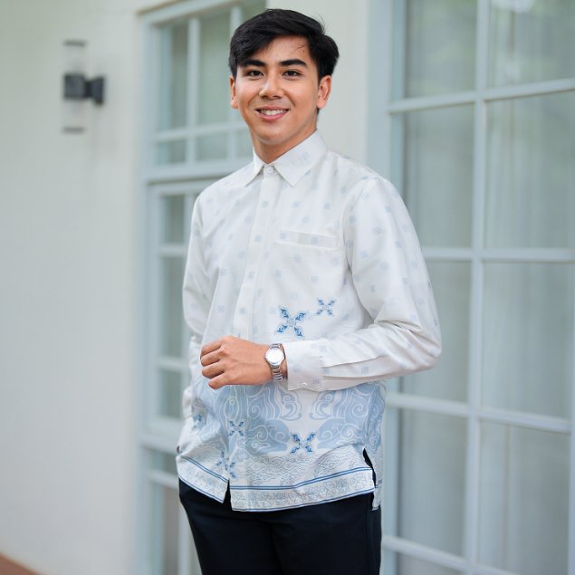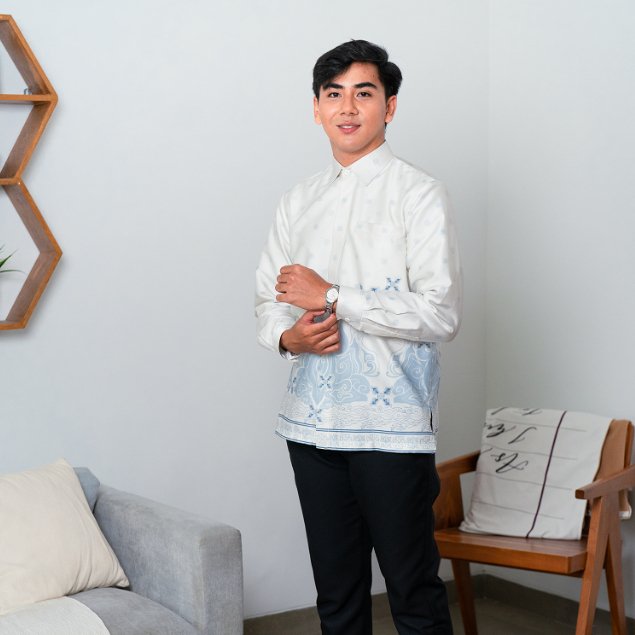Desainnya menampilkan motif batik mega mendung geometris halus berwarna biru klasik, menciptakan kesan tenang namun tetap berwibawa. Potongan reguler fit memberikan kenyamanan maksimal untuk aktivitas seharian cocok dikenakan saat acara buka puasa, shalat Idul Fitri, hingga kegiatan formal kantor.