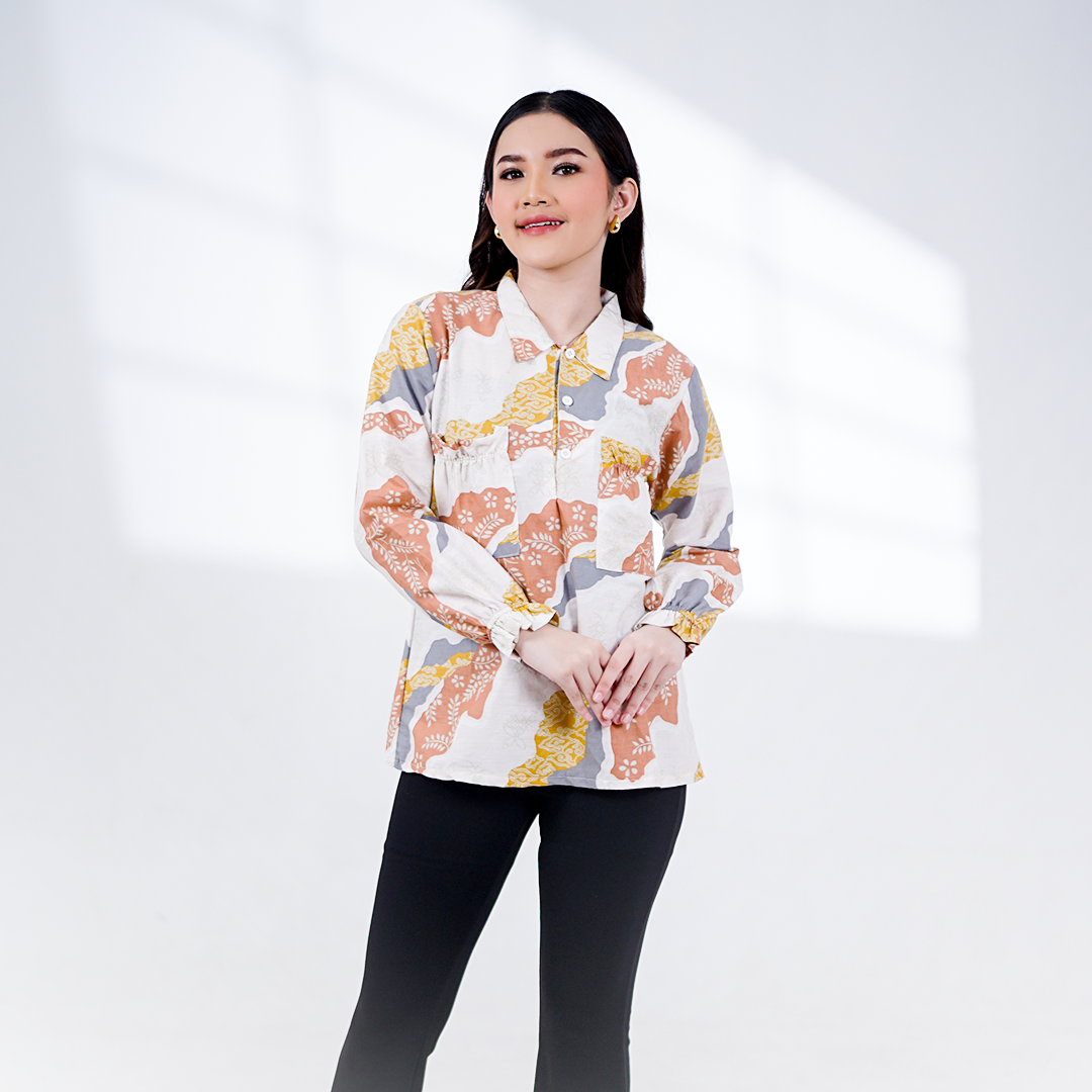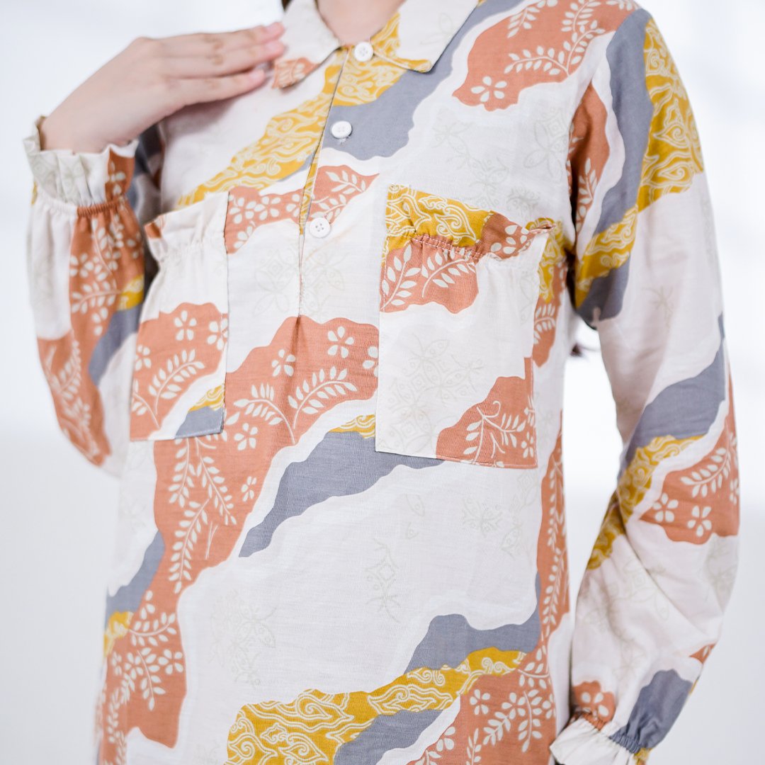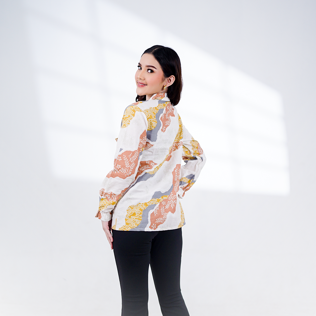 Mengusung motif khas Cirebon Mega Mendung dengan sentuhan pola random, setiap blouse memiliki karakter unik yang eksklusif.