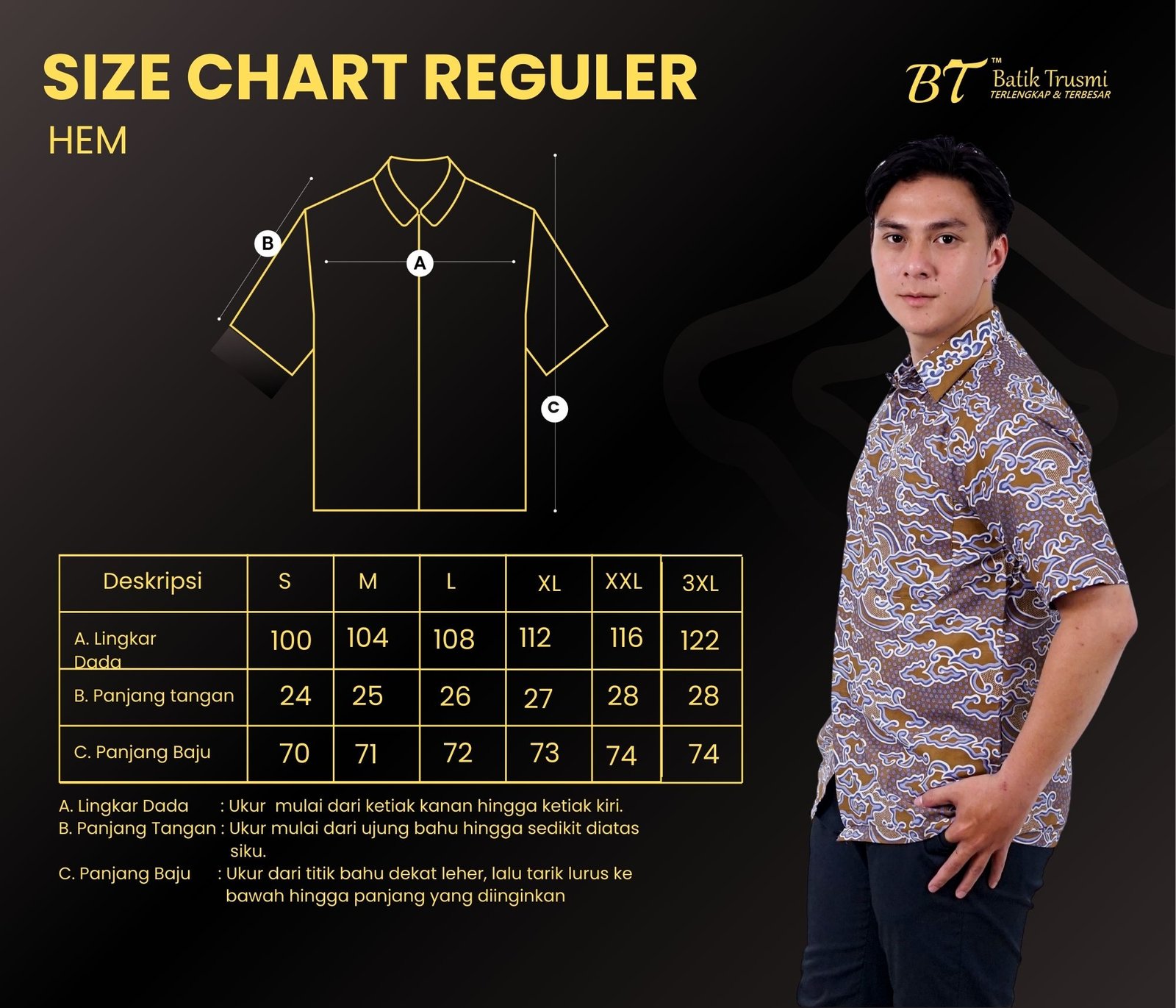 Dibuat dari bahan berkualitas yang lembut di kulit dan nyaman dipakai seharian, hem batik ini dirancang khusus untuk pria yang ingin tampil stylish tanpa meninggalkan sentuhan tradisi. Batik Trusmi selalu menghadirkan detail jahitan rapi, corak eksklusif, dan kualitas terbaik khas batik Cirebon.