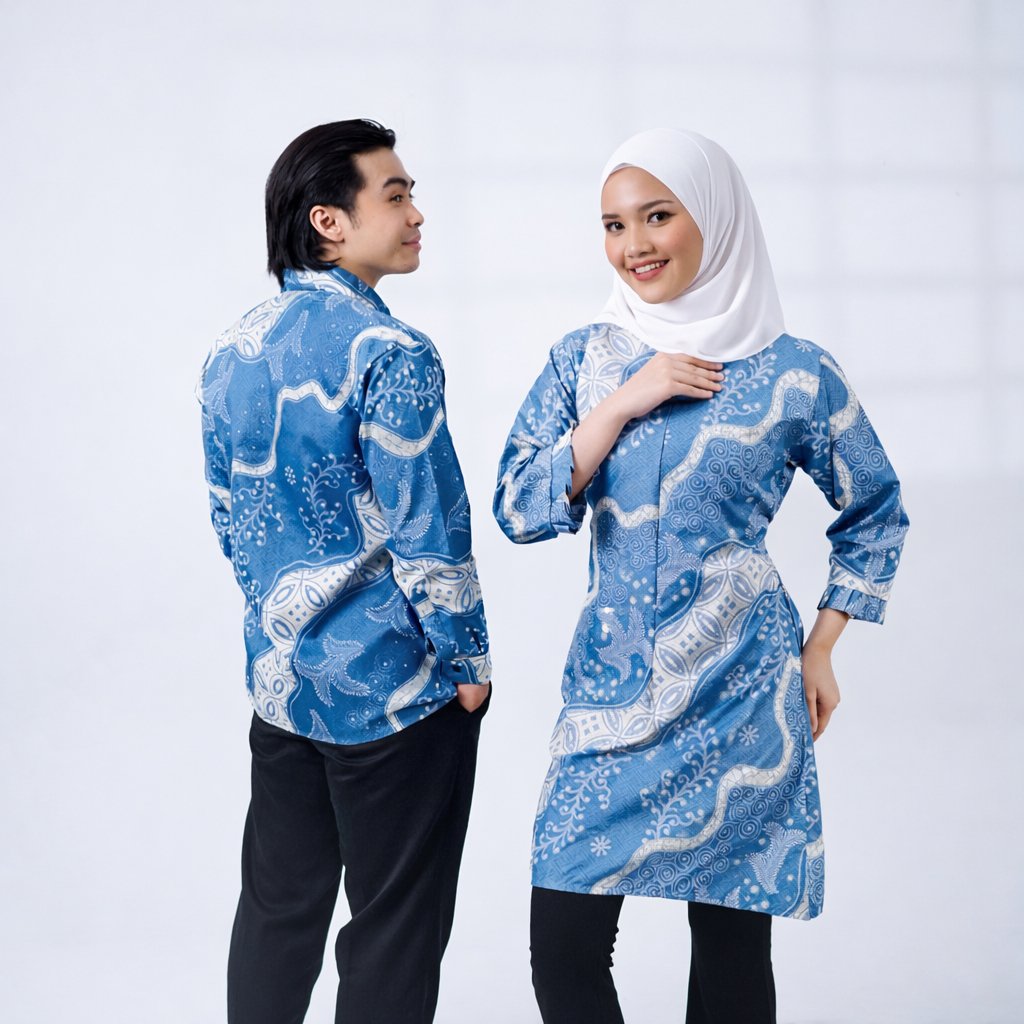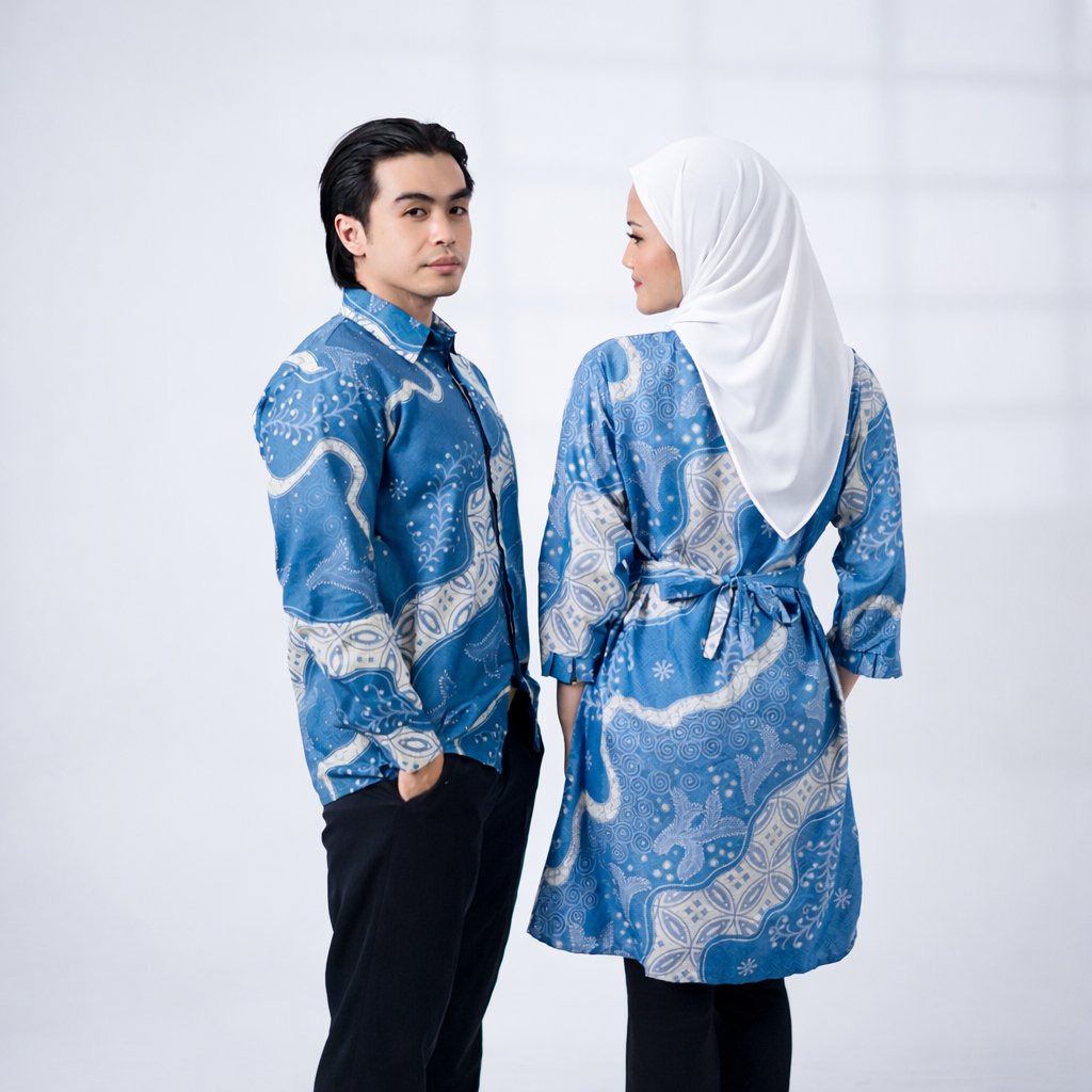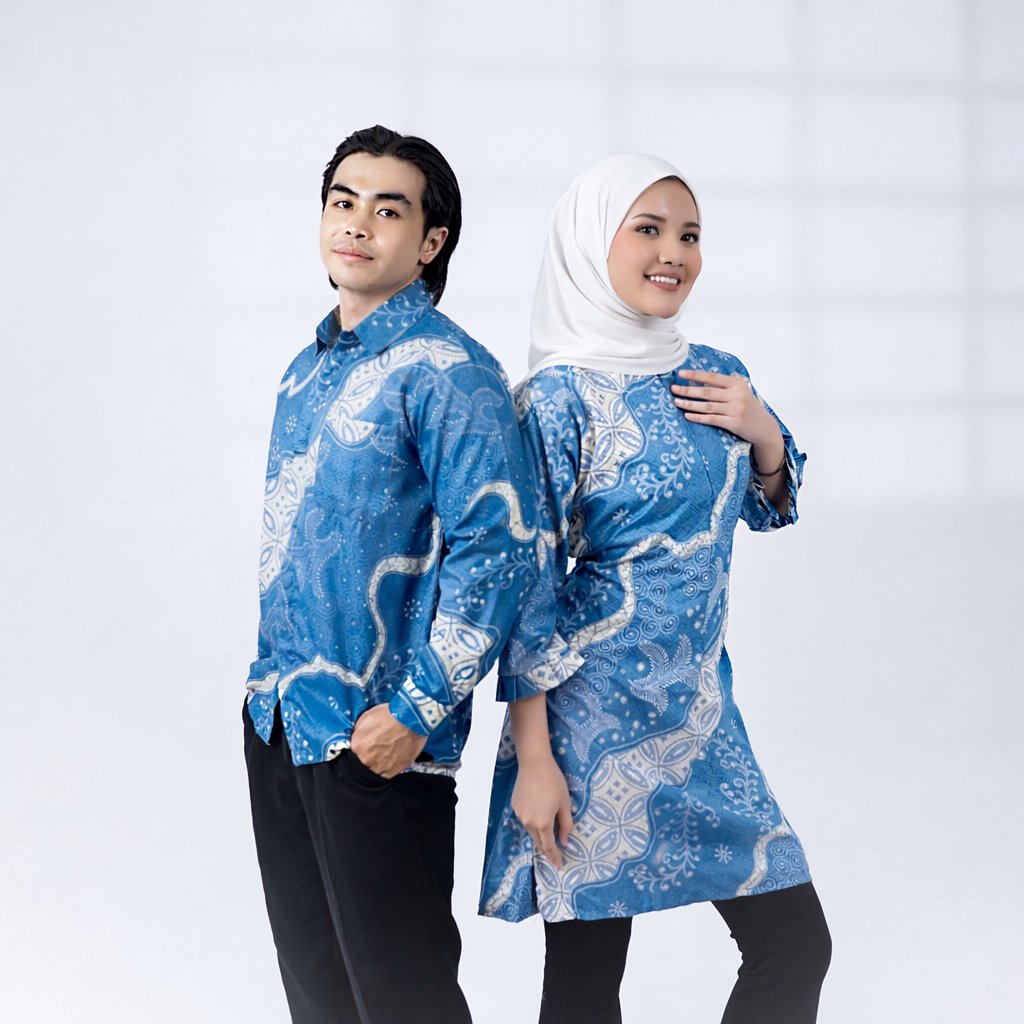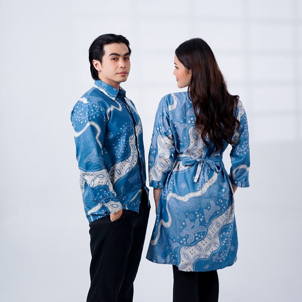 Batik Trusmi Set Couple Tunik Batik & Kemeja Batik Motif Daun Biru